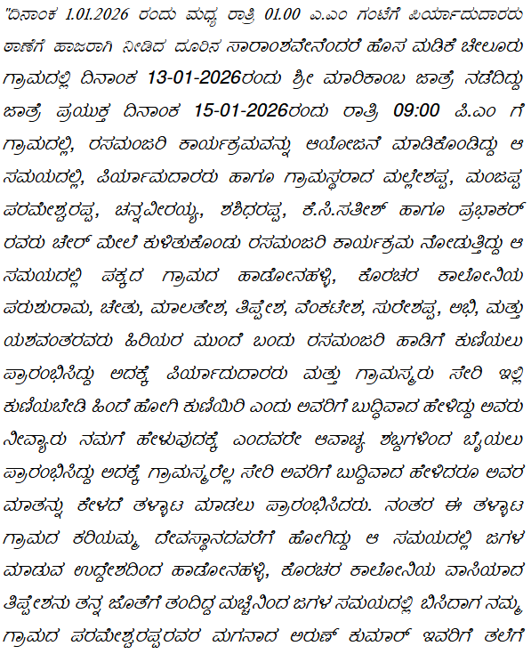 2. Learned counsel for the appellants taking this Court through the records, submits that the alleged incident had taken place on 15.01.2026 at about 10.00 p.m. He submits that on the said date and time, there was jatra in the village of the appellants. On the said occasion, an orchestra was arranged, in which certain Parashuram, Chethu, Malathesh, Thippesh, Venkatesh, Sureshappa, Abhi, and Yeshwanth of neighbouring village were dancing to DJ music right in front of the stage obstructing the view of the people who are seated in the front row, to which the appellant No.1, who is aged 68 years, had asked the said persons to dance by the side and the said persons got enraged and started abusing and accusing appellant No.1. The villagers intervened and advised the said persons not to create commotion which lead to further scuffle.
