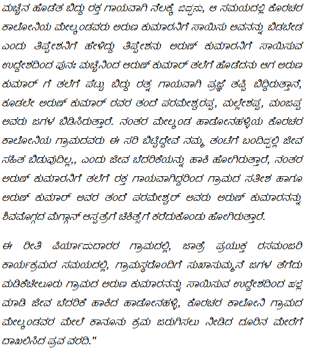 3. Thereafter, one of the members of the said group, who had already come with machete, had assaulted Arun Kumar-appellant No.2, son of appellant No.1 causing severe bleeding injuries. Due to which the said Arun Kumar-appellant No.2 fell unconscious to the ground. The said persons had further instigated one Thippesh to finish off Arun Kumar- appellant No.2. However with the intervention of appellant No.1 herein, Malleshappa and Manjapppa, the said Arun Kumar-appellant No.2 was taken to McGANN Hospital for treatment.