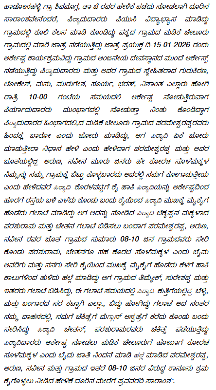 4. One Nagarajappa lodged a complaint on 16.01.2026 at about 1.00 a.m., before the Shivamogga Rural Police which was registered in Crime No.17/2026 for the offences punishable under sections 352, 118(1), 109, 351(2) read with Section 3(5) of the Bharatiya Nyaya Sanhita, 2023.