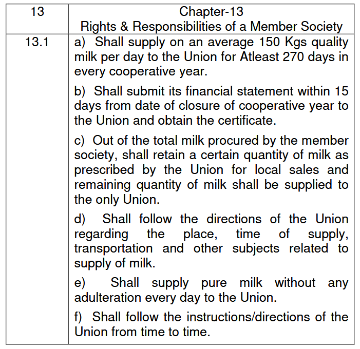 15. In terms of clause 13.1(a) of the bye-laws, the appellant was obliged to supply on an average 150 Kgs. of quality milk per day to the Union for at least 270 days in every co-operative year.