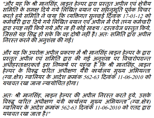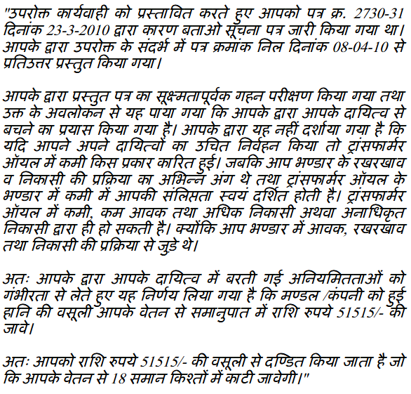2. Learned counsel for the petitioner submits that at the relevant point of time, petitioner was posted as a Line Helper in Area Stores of respondent No.1. A Store Manual has been prepared for the purpose of fixing the duties and responsibilities of the officers looking after the Stores and as per Store Manual, it is clear that the Storekeeper/Junior Engineer (Receipt), Storekeeper (Custody and Issue), stock verifier and Section Officer were responsible for the management of Stores and Line Helper has no role to play either in receipt of material or issuance of the same. Without considering the aforesaid, a show cause notice which was issued alleging that in physical verification of stocks, 6440 liters of transformer oil has been found short hence a recovery of Rs.4,40,000/- is contemplated against the petitioner and other employees. Thereafter, petitioner was not at all responsible for the alleged short stock of oil but without conducting any regular departmental enquiry in the matter, a show cause notice has been issued to the petitioner on 23.03.2010, alleging that 18600 liters transformer oil has been found less in stocks valued at Rs.11,84,262/- and thus a recovery of proportionate amount of Rs.51,515/- is contemplated against the petitioner from his salary. Petitioner has submitted reply dated 08.04.2010 and in reply, petitioner asked relevant documents relating to his responsibility and his role in alleged loss on the basis of which the proposed recovery has been ordered. Without considering the reply submitted by the petitioner and without supplying the documents, impugned order dated 11.06.2010 has been issued by the respondents. Thereafter, petitioner has preferred writ petition No.7122/2010 that has been decided by order dated 28.09.2011 (Annexure P/3) and respondents are directed to decide the appeal of petitioner. Thereafter, petitioner has preferred appeal under Rule 23 of M.P. Civil Services (Classification, Control and Appeal) Rules, 1966 (Annexure P/10).