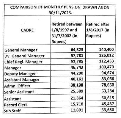 The pay scales of the employees are revised periodically. Such revisions took place during 1989, 1997, 2002, 2007, 2012 and 2017. Since as per Clause 34, the basic pension receivable by a retired employee is pegged at 50% of the average emolument, it tends to be static. The periodical pay scale revisions are not taken note of while calculating the basic pension. As a result, those who retired prior in point of time, though from a higher cadre, draw less pension compared to those who retire from a far lower cadre. This is illustrated by the following comparative chart :
