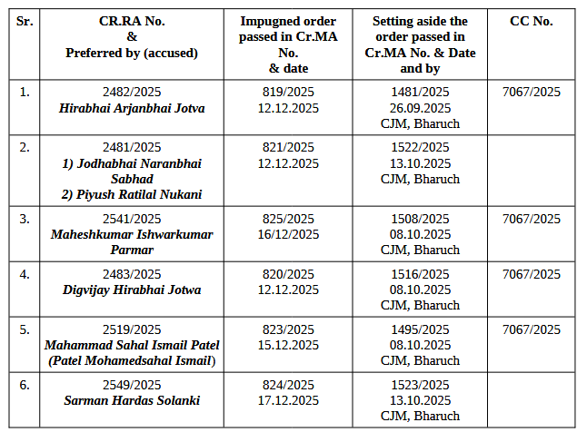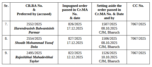 2. By these revision applications, filed under Section 438 r/w. Section 442 of the Bharatiya Nagarik Suraksha Sanhita, 2023 (BNSS), the applicants have challenged the orders, as detailed below, passed by the learned 5th Additional Sessions Judge, Bharuch, whereby, bail granted to the present applicants came to be cancelled:
