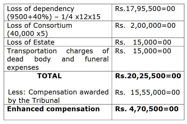 4. The learned counsel for the respondents do not dispute the said assertion of the learned counsel for the appellants that the Tribunal has not properly awarded the compensation towards loss of dependency inasmuch as no future prospects have been awarded in respect of the income of the deceased. There are 5 dependants who have been left behind by the deceased and therefore, the consortium should be (40,000 x5) Rs.2,00,000/-.