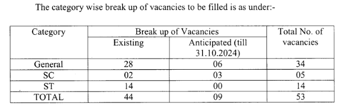 2. The facts of the present case fall within a limited scope. It is borne from the record that Respondent No. 1 issued a notification dated 06.11.2023 inviting applications for appointment to the Delhi Judicial Services ("DJS" hereinafter) notifying 53 vacancies (44 existing and 9 anticipated) with category-wise distribution of 34 General/Unreserved, 05 Scheduled Castes, and 14 Scheduled Tribes vacancies. The notification clarified that the number of vacancies was subject to variation and that admission at all stages of the examination was provisional. The following is the break-up of vacancies for DJS for 2023: