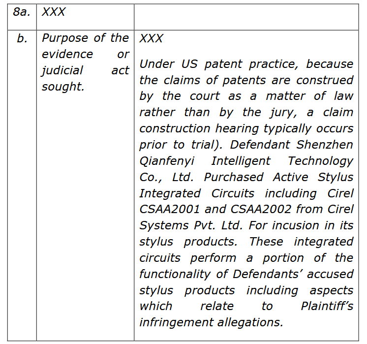 20. The Letter of Request fails to meet the requirements under Article 3 of the Hague Convention, which mandates that it has to specify which documents / property are sought to be inspected or received. The Letter of Request contains a list of documentary requests not limited to the alleged infringing products that form subject matter of the Texas Proceedings, but in relation to "all/any USI Protocol based Active Stylus Integrated Circuits" provided by the Respondent to Shenzhen, not just those used in the two products. This broad and open- ended request includes internal documents in the nature of functional specifications, register-level specifications, data sheets, roadmap presentations, compliance and certification documents, developer manuals etc., for products provided by the Respondent to Shenzhen. The Letter of Request seeks to cast a wide net for production of a vast, all-encompassing range of documents with no explanation for their relevance or necessity.