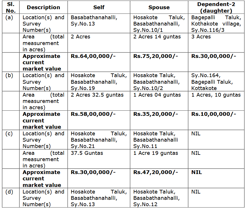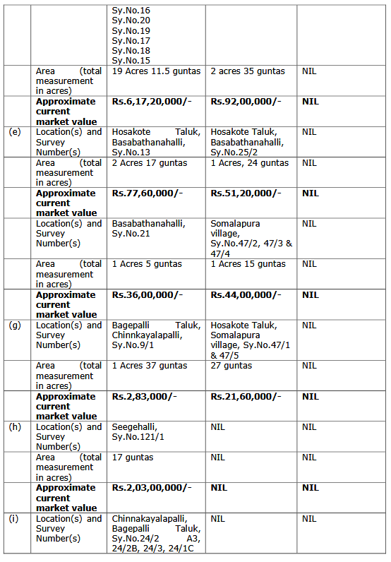 3.10 Regarding the allegation pertaining to non mentioning of survey numbers at Sl.No.(7)B(i)(d), it is stated that Respondent No.1 by oversight has mentioned Sy.No.15 instead of Sy.No.5 to which he is the owner. That it was only a typographical error and Respondent No.1 has not done the same deliberately. That land in Sy.No.5 of the Basabathanahalli Village, Hosakote Taluk, is measuring 38 guntas and 1 gunta of kharab land. Whereas, land in Sy.No.15 is measuring around 3 acres 15 guntas and the Respondent No.1 is not the owner of the same, which is evident from the RTC produced by the petitioner himself. That total extent of land in Sy.Nos. 13, 16, 20, 19, 17, 18 and 5 is 19 acres 11 and a half guntas which is the actual extent declared by Respondent No.1 in Form 26 Affidavit. Though inadvertently instead of Sy.No.5, Sy.No.15 is mentioned the total extent shown by the Respondent No.1 tallies with the extent owned by him.