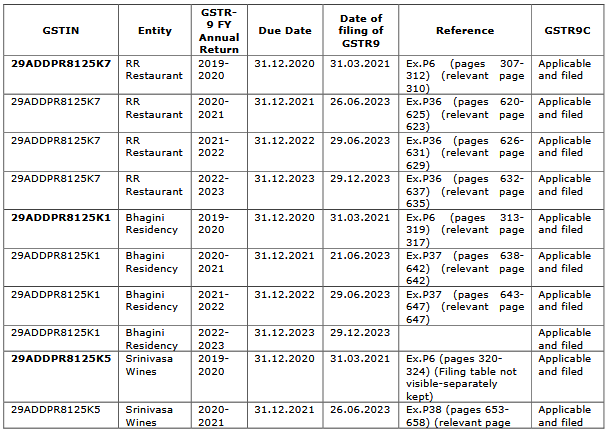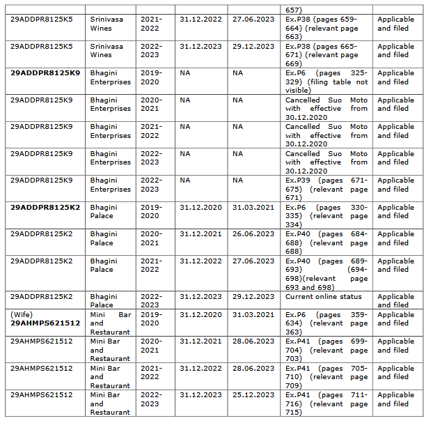 6.4 That annual returns of aforesaid five business concerns in Form No.GSTR-9 was not filed for the year 2020-2021 onwards and GSTR-3B in relation to Srinivasa Wines was filed belatedly for two months as such late fee was due and the same was not disclosed. That Section 44 and 47 of the CGST Act stipulates that the GSTR-9 are to be filed for each of financial years within the due date prescribed. That the conduct of Respondent No.1 in filing the return subsequent to filing of the election petition and suppressing such information in pleading shows malafide intent.