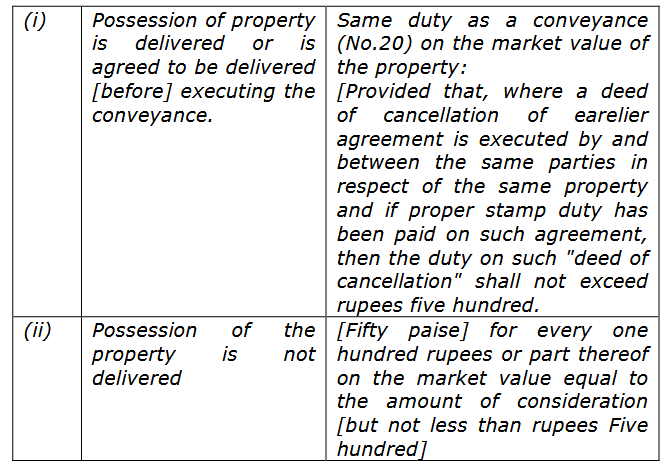 9. The plain language employed in Article 5(e)(i) does not create any ambiguity with regard to the stamp duty payable, when possession is delivered. If the agreement of sale of immovable property is in part performance of the contract and the possession of the property is delivered or is agreed to be delivered before executing the conveyance, then the stamp duty payable on such an instrument would be the same as conveyance under Article 20 of the Act. The aforesaid Article deals with two situations, firstly, the possession of the property is delivered under the agreement and secondly, the possession is agreed to be delivered before the actual conveyance i.e. before the execution of the absolute sale deed. The contention of the petitioner that prior delivery of possession, which is recognised under the agreement is also covered under Article 5(e)(i), is fallacious.