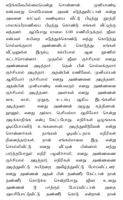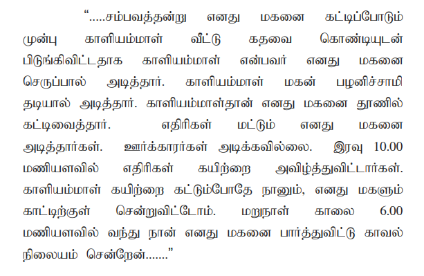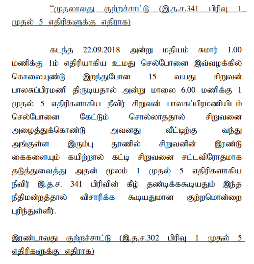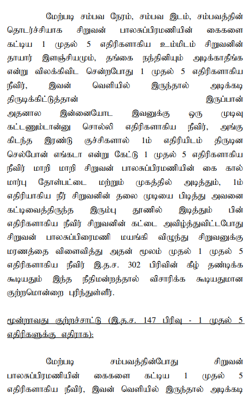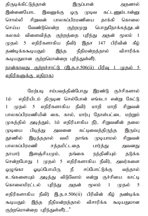 2. The case of the prosecution is that the deceased Balasubramani was in the habit of stealing small things at small level and as such, he used to be found with small injuries in his body. While his mother questioned about the injuries, he used to say that the injuries were caused due to the attacks of the nearby villagers while being caught red-handed when stealing. While being so, on 22.09.2018 at about 18.00 hours, the deceased allegedly had stolen the mobile phone belonging to the first accused, therefore, the deceased was searched by the first accused and he was enquired about the mobile phone, but he did not give any answer. Thereafter, he was brought to his house and all the accused persons have tied him to the iron pillar erected at his house using a cotton rope and have indiscriminately beaten him. Though the mother of the deceased, the sister of the deceased’s mother and the sister of the deceased were trying to pacify the accused, they lynched him shouting that if he is left, he would do the same act and so he would be finished. All the accused attacked the deceased with iron rods and all the accused lynched the deceased with two sticks. When the mother of the deceased, sister of the deceased’s mother and the sister of the deceased attempted to prevent them from lynching the deceased, the accused persons had threatened them to go away, failing which, they would be beaten up and therefore they went away from that place out of fear of life. Thereafter, the deceased fainted and fell down and all the accused removed the rope from the hands of the deceased and went away from the place of occurrence and the deceased died on the spot. Thereafter, the mother of the deceased i.e., P.W.1 filed a complaint. Based on the complaint, FIR in Cr.No.292 of 2018 has been registered for the offences punishable under Sections 147, 341, 506(ii) and 302 IPC. After completion of investigation, the respondent filed a final report and the same has been taken cognizance by the Trial Court in S.C.No.28 of 2018, on the file of the learned Additional Sessions Judge/Fast Track Mahila Court, Karur.