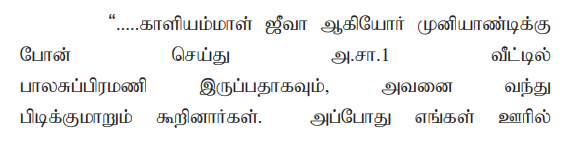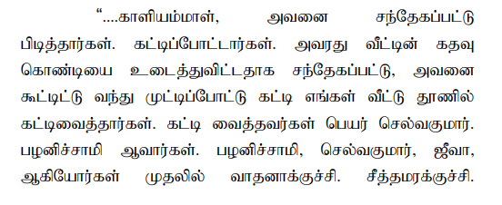 9. It is a very unfortunate case where the minor deceased has had the habit of stealing small things and was used to get beaten up by the fellow villagers. While so, on 22.09.2018 when the mobile phone of the first accused was missing, he suspected that the deceased had stolen it and further, the respondents, Kaliammal and one Jeeva had caught hold of the deceased for inquiring about the stealing of mobile phone that belonged to the first accused. The said Kaliammal and Jeeva had tied the deceased’s hands to an iron pillar at the deceased’s house, that too, in the presence of the mother of the deceased, sister of the deceased’s mother and sister of the deceased. The deceased’s mother was examined as P.W.1 and her sister was examined as P.W.2 and the sister of the deceased was examined as P.W.3. Though P.W.1 categorically stated about the specific overt act of the respondents 1 to 5 herein, she also stated the specific overt act of the said Kaliammal and Jeeva, who tied the hands of the deceased. The relevant portion of P.W.1's cross-examination is reads as follows: -