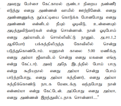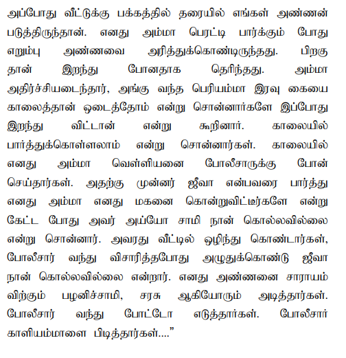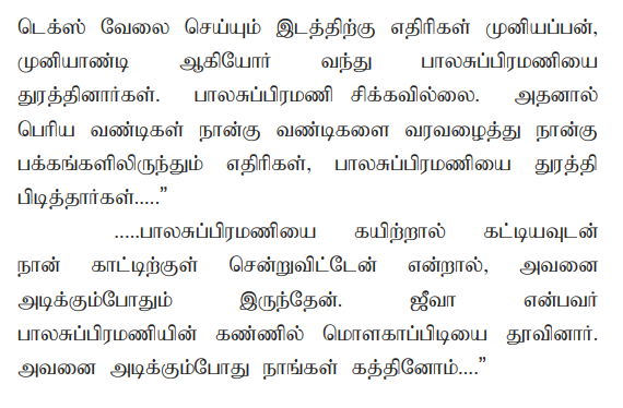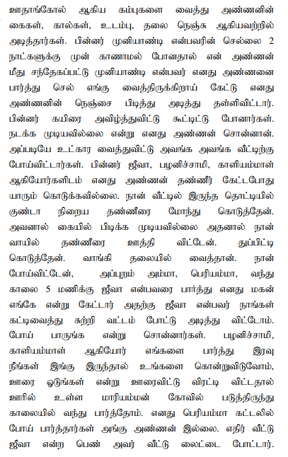 11. The sister of deceased was examined as P.W.3 and she had also clearly spoken about the overt act of the Kaliammal and Jeeva. The relevant portion of her evidence is read as follows: