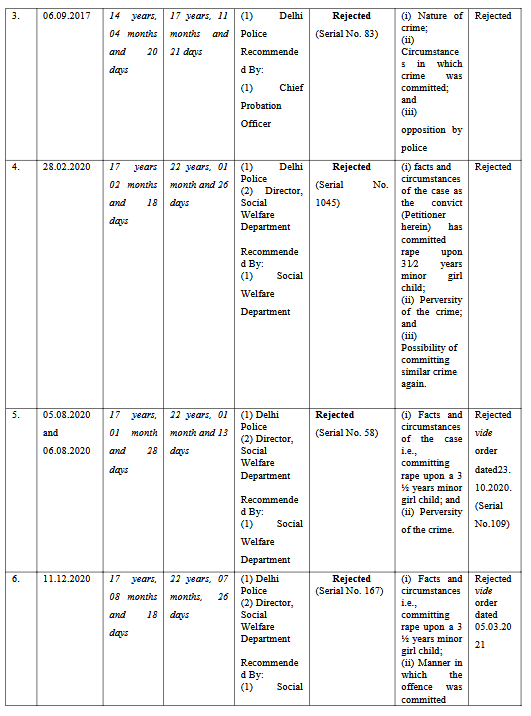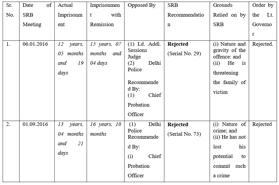 5. The case of the Petitioner was considered for the first time by the SRB for pre-mature releaseon 06.01.2016, in view of the fulfilment of the conditions for pre-mature release. However, vide Minutes of Meeting dated 06.01.2016, the SRB rejected the Petitioner’s premature release on the basis of nature and gravity of the offence and the threat to the family of the victim, despite the recommendation of the Chief Probation Officer. This was followed by second rejection by SRB vide its Minutes of Meeting dated 01.09.2016.