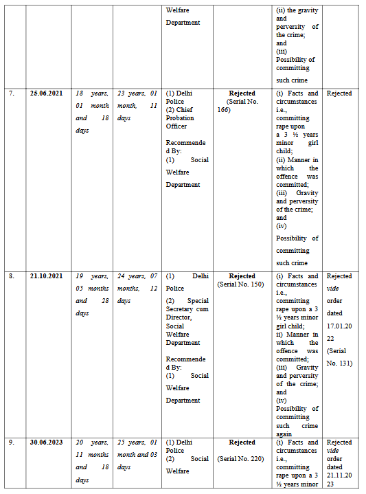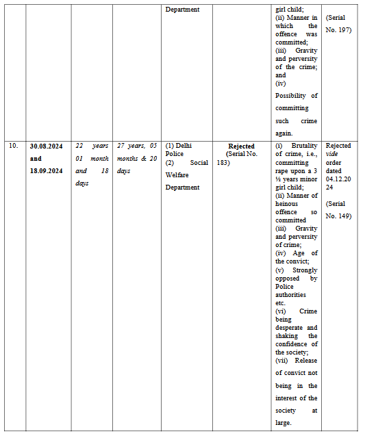 8. The Petitioner faced his 10th Rejectionvide Minutes of Meeting of SRB dated 30.08.2024 and 18.09.2024; again, on the basis of heinousness and manner of crime, gravity and perversity of the crime, age of the convict and strong opposition by the Police authorities, etc.